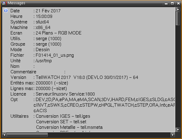 La date, l'heure, le nom du système, le type de machine et d'affichage (carte graphique, nombre de couleurs).