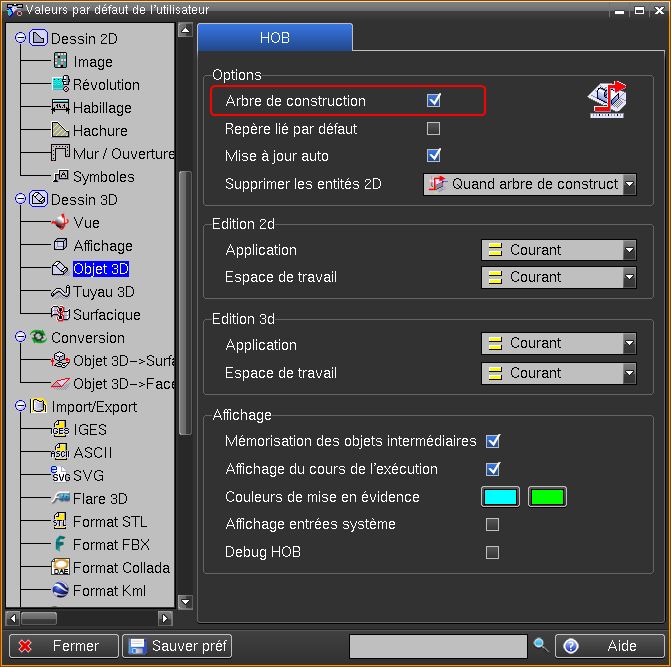 Cette fonction permet d'activer ou désactiver l'enregistrement de l'arbre de construction avec les objets 3D lors de leur créations ou modifications. « Préférences / Graphique / Options / Dessin 3D / Objet 3D / HOB à Arbre de construction ON/OFF »