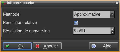 Permet d'initialiser les paramètres de conversion de la fonction courbe -> arcs. La méthode Approximative est conseillée car elle produit une suite d'arcs de cercle très proche de la courbe initiale.