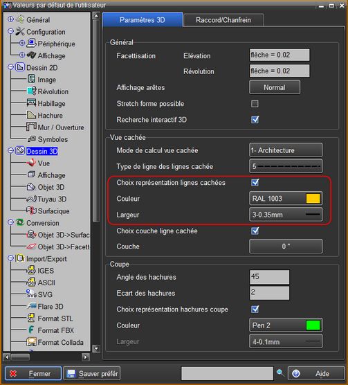 Permet de définir la largeur utilisée pour les arêtes cachées. Ce choix s'applique dans les fenêtres 3D, dans les zones vue des mises en plan, et lors des conversions 3D->2D. Pour que la largeur soit utilisée il faut que la fonction Choix ligne cachée soit activée (on).
