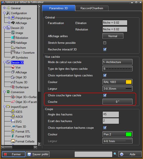 Permet de définir la couche utilisée pour les entités représentant les arêtes cachées, générées par la conversion d'une vue 3D. Pour que la couche soit utilisée il faut que la fonction Choix couche conversion On/Off soit activée (on).