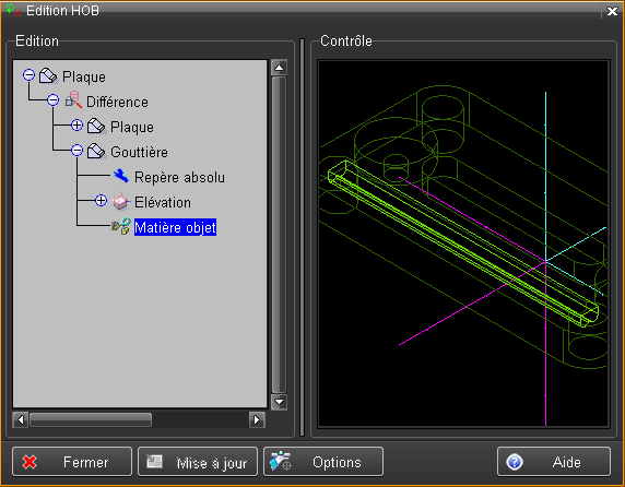 Le système ajoute automatiquement la fonction Matière objet à l'outil « Gouttière », visible ici dans le HOB de l'objet final.