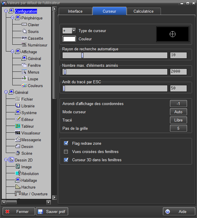 Cette fonction donne accès à de nombreux paramètres modifiables par les utilisateurs. Cela comporte des paramètres d'affichage, mais aussi diverses configurations concernant le 3D, les conversions ou encore l'horlogerie. Cette fonction mieux organisée et plus complète, remplace l'ancienne fonction Modif préférences (353).