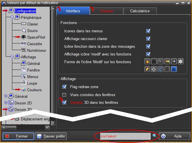 Le bas de la fenêtre comprend une zone de recherche dans les options de l'utilisateur. Après l'entrée d'un texte de recherche, le système affiche en rouge tous les textes et toutes les zones comportant le texte de recherche. Cette fonctionnalité facilite grandement la recherche des options de l'utilisateur.