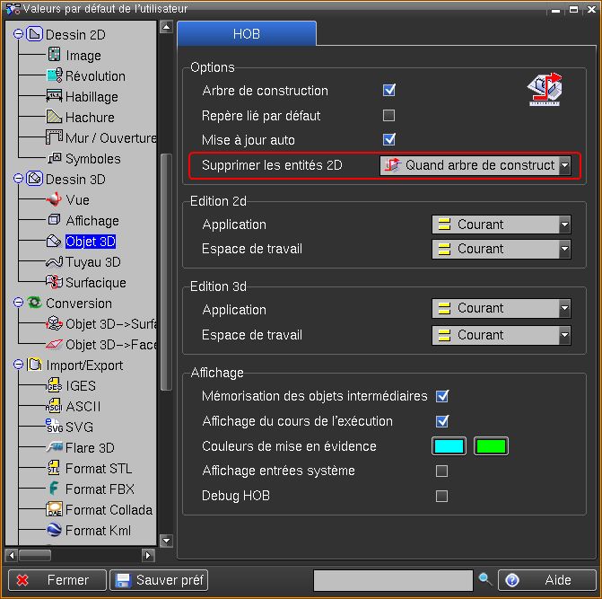 Le contour 2D qui définit le profil d'un nouvel objet est conservé dans l'historique de construction (HOB), ce qui permet en général de le supprimer dans le dessin courant.