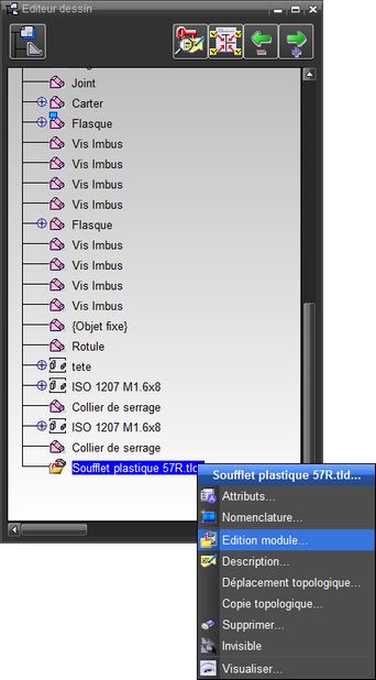Il existe deux possibilités pour modifier un module. La première peut s’effectuer en relisant le fichier du module. La seconde peut s’effectuer dans le dessin au travers du browser de pièces. En sélectionnant l’objet module, contextuellement la fonction « Edition module » est accessible et permet ainsi d’éditer l’objet module dans son contexte d’assemblage. Partant du principe qu’un module peut être impliqué dans d’autres dessins, il est fortement recommandé de contrôler les cas d’emploi ( au travers de la fonction Recherche fichiers (1401)) avant d’effectuer une modification.