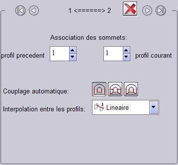 Création des couplages fixes : les boutons verts permettent de passer d'un sommet à un autre. Interpolation entre un couple de profil : on peut choisir le type d'interpolation entre deux profils consécutifs (linéaire, cubique, quadratique, sinus...) Couplage automatique : le couplage automatique permet de coupler les sommets de manière automatique entre deux couplages fixe. •Ratio : c'est le mode par défaut, les sommets se reportent sur le profil suivant et précédant en fonction de leur ratio. •Sommets couplés puis ratio : si entre deux couplages fixes on a le même nombre de sommets libres, on les associe, sinon on passe en mode ratio. •Sommets brisés puis ratio : idem mais avec les sommets brisés. Tous les couples de profils : on peut appliquer une interpolation ou un couplage automatique à tous les couples de profils. Calcul et check du maillage : l'option de calcul automatique du maillage lance le calcul du maillage, et relance le calcul en cas de modification des inputs. Une option de check du maillage permet de visualiser les facettes qui s'intersectent et de modifier les inputs du « multi-sweep » pour remédier à ce problème.