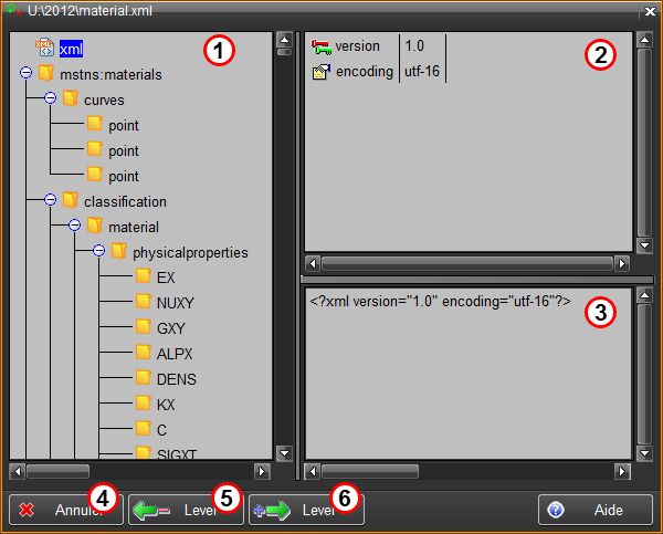1.Zone de sélection de l'entrée XML 2.Zone d'affichage des attributs (nom et valeur) de l'entrée XML sélectionnée 3.Zone d'affichage du code XML de l'entrée XML sélectionnée 4.Bouton de sortie de la boite de dialogue d'affichage du fichier XML 5.Affichage d'un niveau de moins dans la zone de l'arbre XML 6.Affichage d'un niveau de plus dans la zone de l'arbre XML
