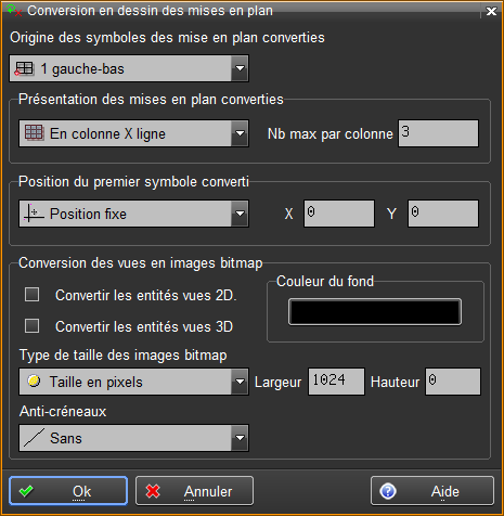 La fonction Conversion mise en plan permet de convertir en une fois toutes les mises en plan du dessin courant. Plusieurs options sont proposées, dont la conversion en images bitmap (plutôt qu'en dessin vectoriel).
