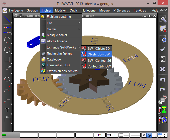 1.Ouvrir dans SolidWorks une nouvelle pièce pour le transfert d'un objet ou un nouvel assemblage pour le transfert de plusieurs objets. 2.Transférer l'objet ou les objets de la sélections de Tell vers SolidWorks avec la fonction 'Objets 3D -> SW'. 3.Les objets sont transférés dans SolidWorks.