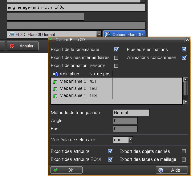 Lorsque le format Flare3D a été sélectionné un bouton 'Options Flare 3D' est affiché pour permettre la sélection d'une animation cinématique ou d'un montage/démontage à enregistrer. Si l'option 'Export déformation ressorts' est activée, les ressorts doivent être nommés et chaque ressort doit avoir un nom unique. Si ce n'est pas le cas le système modifie automatiquement le nom des ressorts ne répondant pas aux critères.