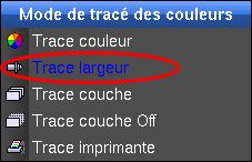 Cette fonction autorise l'association d'une couleur à une largeur. Si la fonction est active, l'option 'Trace largeur' est ajoutée aux modes d'affichage du dessin. Cette option est enregistré avec les paramètres par défaut de l'utilisateur.