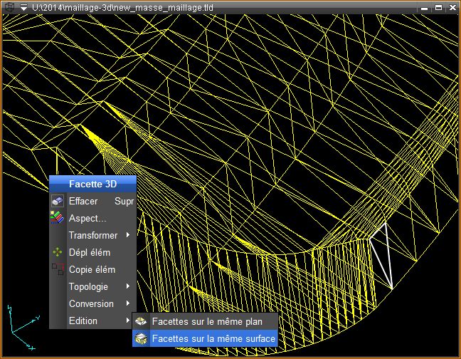 Recherche des facettes se trouvant sur la même surface que les facettes de la sélection. Une surface est définie lorsque l'angle entre deux facettes est plus petit ou égal à celui défini. Après la sélection des facettes désirées, avec la touche modif de la souris dans une zone vide le menu contextuel permet de sélectionner la fonction 'Facettes sur la même surface' qui recherche toutes les facettes qui se suivent avec un angle plus petit ou égal à celui défini.