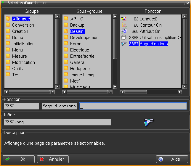 Lors de la sélection de la fonction 2387 (Page d'option) il est possible de sélectionner la page d'options désirée.