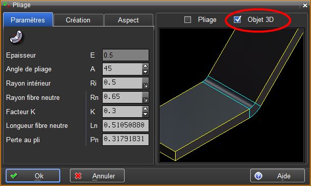 Alternativement, il est possible de visualiser la zone du pli dans l'objet.