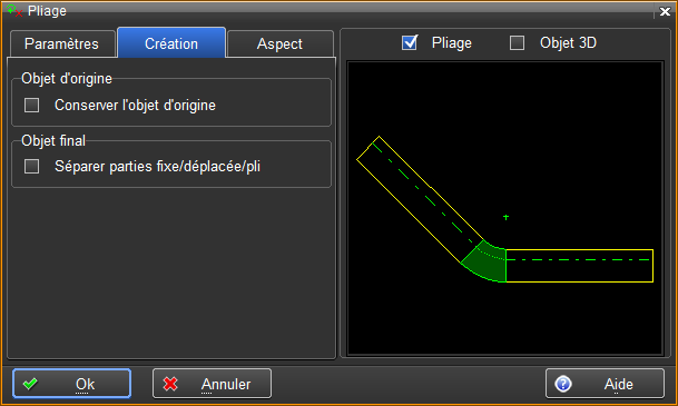 •Objet d'origine : Il est possible de conserver l'objet d'origine en plus de l'objet plié. •Objet final : Une autre option permet de générer les trois parties de l'objet plié sans les unir, la partie fixe, la zone de pli, et la partie mobile (les objets créés n'ont pas de HOB ). |