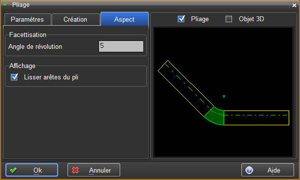 •Angle de pliage (90° par défaut) •Angle de résolution (5° par défaut) •Drapeau lissage des arêtes On/Off (On par défaut) Cas traités