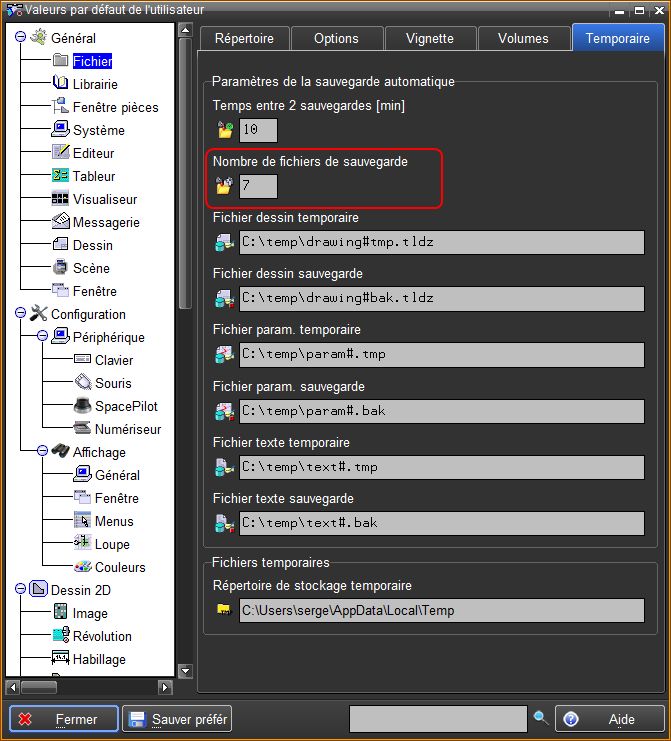 Permet de spécifier le nombre de fichiers de sauvegarde. Tell enregistre régulièrement le dessin courant dans un fichier temporaire ayant l'extension '.tmp.tldz'. Lors de l'enregistrement de ce fichier temporaire, le précédent est enregistré en sauvegarde avec l'extension '-00.bak.tldz'. La valeur numérique représente la liste des derniers fichiers de sauvegarde avec le plus grand nombre pour le fichier le plus ancien et le plus petit nombre pour le fichier de sauvegarde le plus récent. Cette fonction peut être modifiée dans les options de l'utilisateur.