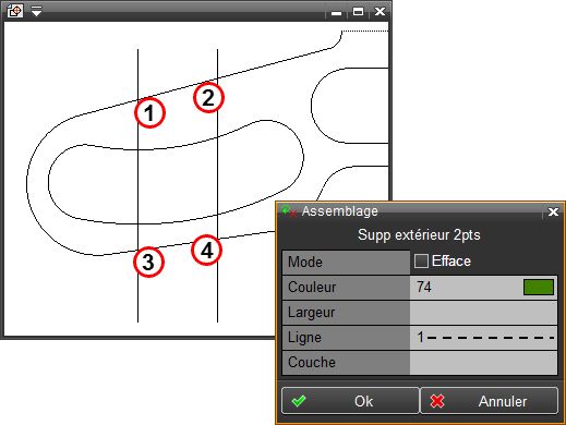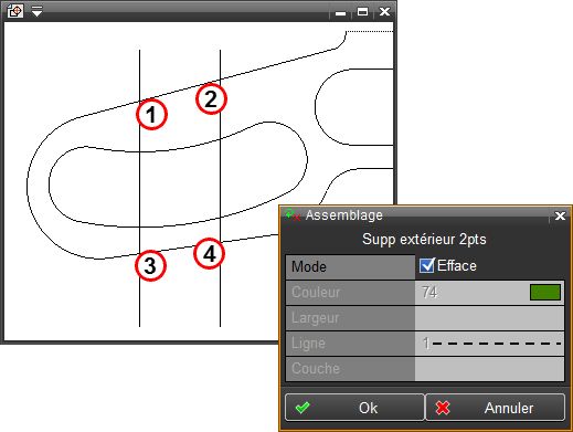 La touche Modif de la souris permet de modifier les paramètres de la fonction. Ces paramètres permettent d'activer la suppression de la partie intérieur sélectionnée ou de la modifier en donnant la couleur, la largeur, le type de ligne et la couche. Les paramètres sont ceux des fonctions d'assemblage et peuvent être modifiés dans Modif préférences et sont enregistrés dans les paramètres par défaut de l'utilisateur.