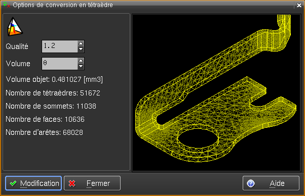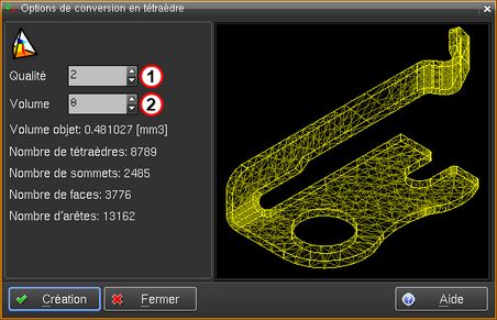 La fonction de création d'un maillage 3d affiche le résultat du maillage et permet de modifier la qualité du maillage et le volume maximum des tétraèdres générés.