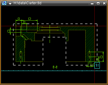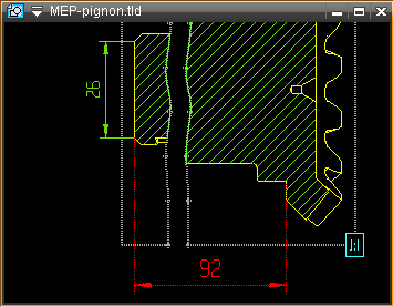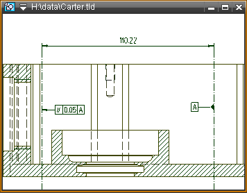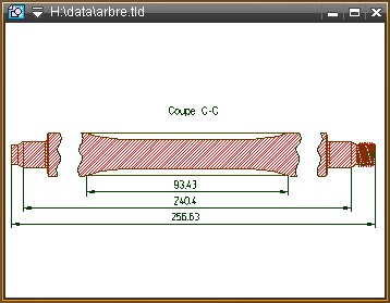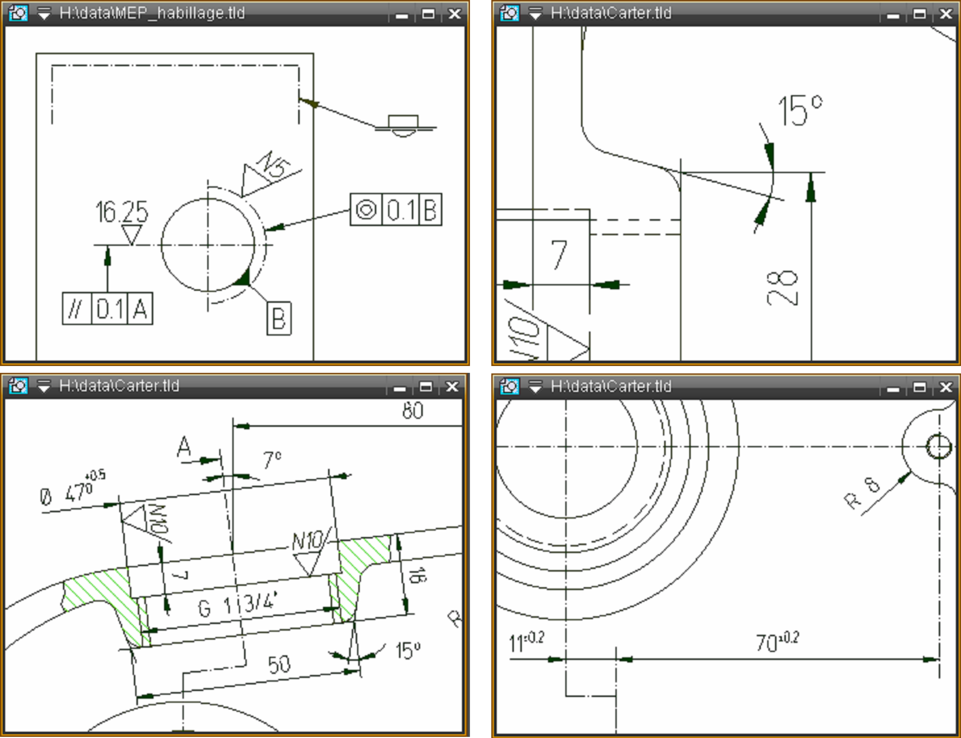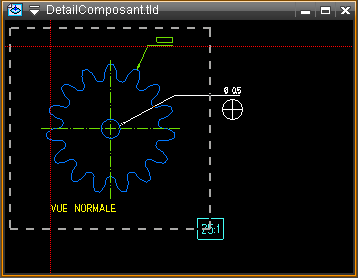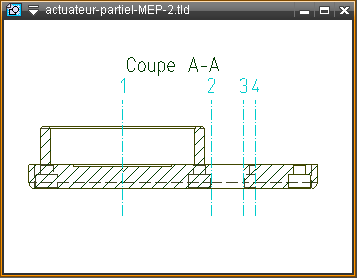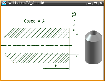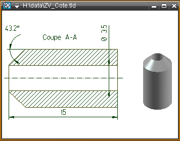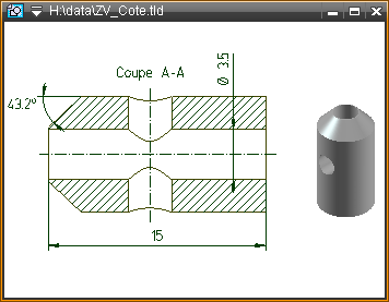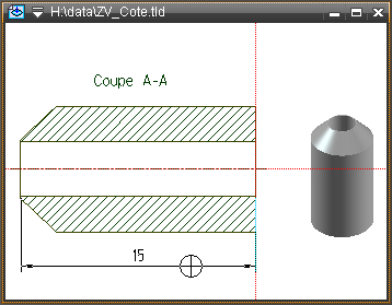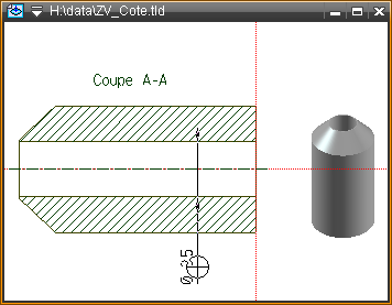 Exemple de zone vue d'un objet 3D, avec diverses cotes et traits d'axes, ainsi que des cotes de niveau, de surface et de filetage, et des lignes de coupe.