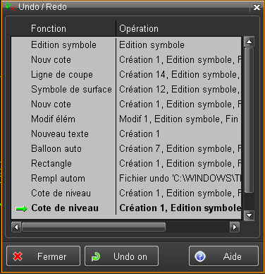 Sélection Comme dans les fenêtres 2D, on peut sélectionner des entités de l'habillage une à une, ou dans une zone rectangulaire. Elles peuvent être modifiées ou supprimées. La modification ou la suppression des lignes de coupe entraîne la modification des zone vue liées, ou la suppression du lien. Le menu contextuel permet d'appliquer des changements à toutes les entités sélectionnées. Touche MODIF Le fonctionnement de la touche Modif (MODIF) sur une entité d'habillage est identique à celui dans les fenêtres 2D. Comme pour la création d'habillage, dans la Liste Undo/Redo on trouve typiquement la suite : « [Nom de la fonction] Modif [n], Edition symbole, Fin édition ».