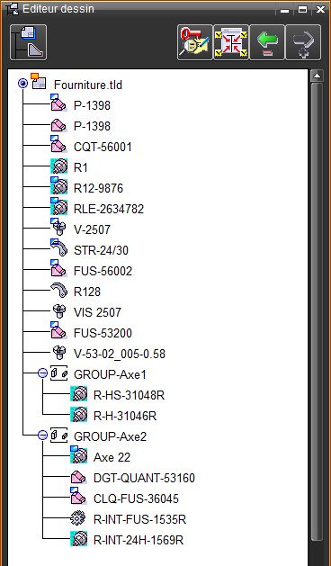 On peut ainsi voir qu'il existe une mise en plan d'ensemble (de tout le dessin) : On reconnaît également les mises en plan de détail avec l'icone: Pour les mises en plan mélangées, assemblages de plusieurs éléments, l'icone est le suivant :