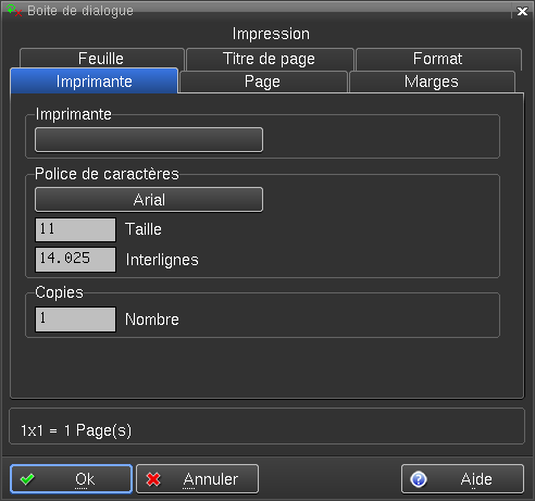 Sélection de l'imprimante, de la police de caractères utilisée et du nombre de copies.