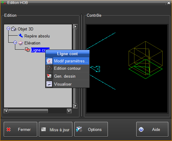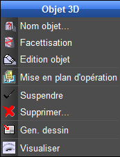Les fonctions contextuelles présentes dans l'édition du HOB sur un objet 3D dépendent du type de l'élément sur lequel est édité le menu contextuel: