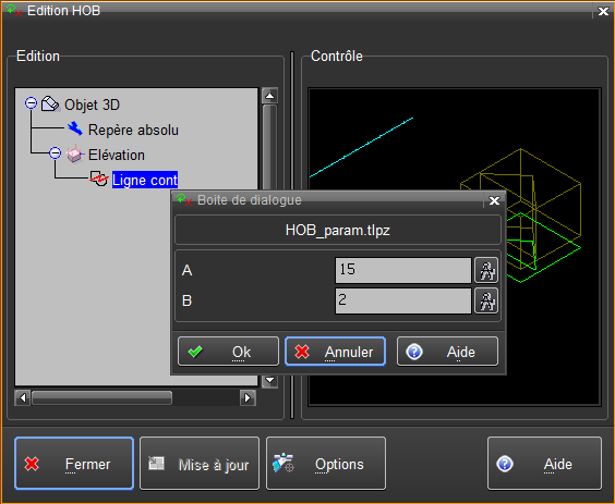 Cas d'un dessin paramétré Un contour 2D supportant une opération 3D peut être de nature « paramétrée », c'est-à-dire qu’il est créé et sauvé en mode « paramétré ». Les variables du contour 2D paramétré peuvent être modifiées dans le HOB.
