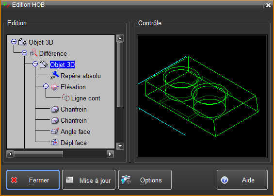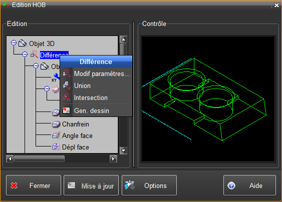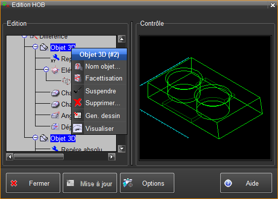 Toutes les fonctions du menu contextuel Selon la ou les ligne(s) sélectionnée(s) dans l'historique, certaines des fonctions suivantes sont affichées dans le menu contextuel. •Nom objet : modifie le nom de l'objet de l'entrée courante du HOB •Facettisation : modifie les paramètres de facettisation utilisés pour la fonction de création courante •Modif paramètres : modifie les paramètres enregistrés avec la fonction courante, variables selon la fonction •Modif matière : modifie la matière associée aux fonctions Chanfrein sélectionnées •Edition contour : permet de modifier ou même de remplacer un contour 2D utilisé par une fonction (voir Edition contour dans Edition HOB ) •Edition objet : permet de modifier ou même de remplacer un objet 3D et toute sa branche du HOB (voir Edition objet dans Edition HOB ) •Edition composant : modifie les paramètres du composant •Figer composant : transforme un composant en objet •Mise à jour : pour les fonctions Axe 3D lié, Enveloppe, Elevation face, et Balayage multi-profils, qui sont liées à d'autres entités du dessin. •Mise en plan d'opération : pour fixer une vue de mise en plan d'opération à cette étape du HOB •Suspendre / Activer : suspend ou réactive l'exécution de la fonction sélectionnée, sans la retirer du HOB •Supprimer : supprimer la fonction sélectionnée (et tout l'arbre de l'historique qui en dépend) dans le HOB •Déplace repère : permet de modifier la position d'un repère, relativement à lui-même •Union / Différence / Intersection : il est possible de remplacer une opération booléenne par une autre •Elévation / Elévation inclinée : il est possible de remplacer une fonction d'élévation par l'autre •Déplacement en haut / Déplacement en bas : l'ordre d'exécution de certaines fonctions du HOB peut être modifié •Gen dessin : génération de l'entrée courante dans le dessin (elle sera partiellement confondue avec l'objet dont le HOB est édité) •Propriétés : indique, pour l'objet final (à la racine du HOB) ses heures et dates de création et de modification •Visualiser : ouvre une fenêtre et représente l'entrée courante. •Affichage erreur : l'icone