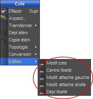 Après avoir sélectionné une cote, en affichant le menu contextuel à l’aide de la touche MODIF de la souris, sous « Edition » des fonctions de modification pour la présentation sont disponibles:
