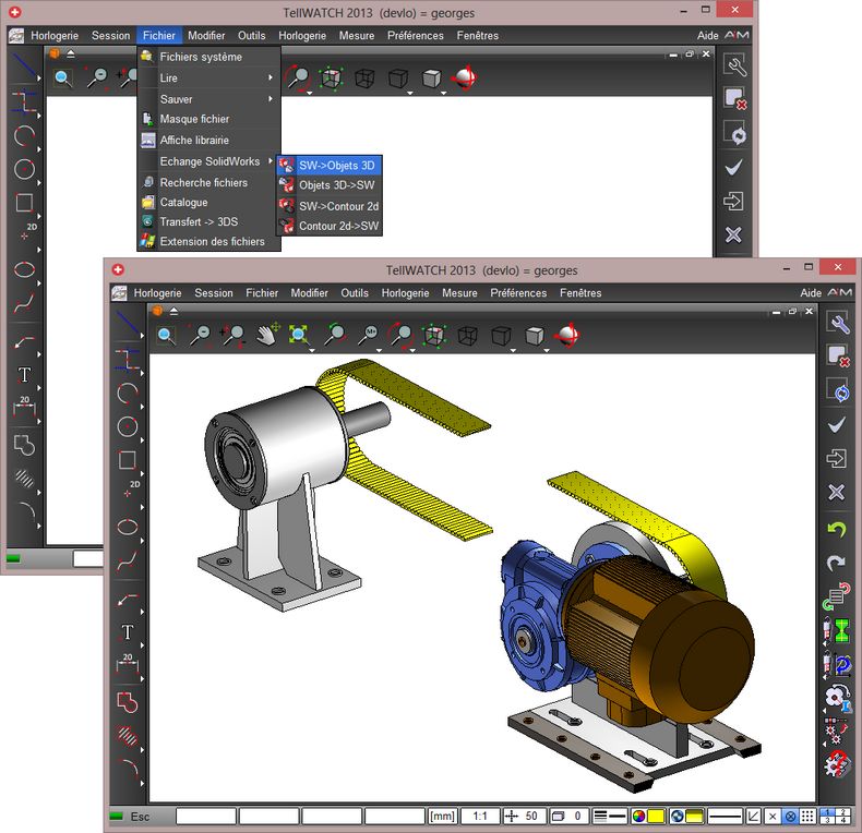 Voir la fonction Transfert -> 3DSMax CONVERSION SolidWorks Il est possible d'exporter des objets volumiques de Tell dans SolidWorks, soit dans un document d'Assemblage, soit dans un document de Pièce. Les objets créés dans SolidWorks sont construit avec l'historique qui provient de Tell (HOB).