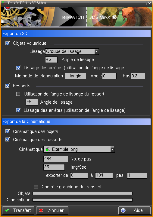 CONVERSION 3DS Max Le transfert des données est réalisé en deux étapes. La première transfert les objets volumiques et les ressorts ainsi que les matières ou couleurs qui leur sont associées, puis la deuxième transfert l'animation cinématique sélectionnée comprenant le déplacement et la rotation des objets ainsi que la déformation des ressorts ou les déplacements si une entité montage/démontage a été sélectionnée.