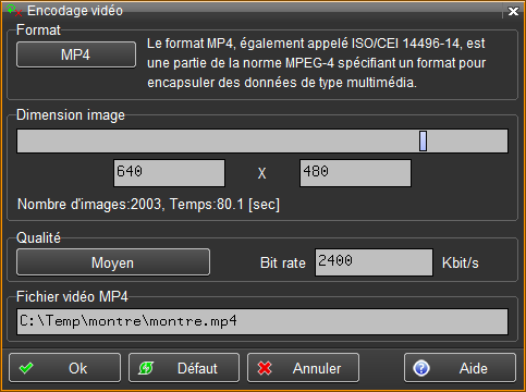 Voir la fonction Liste des fonctions . Encodage vidéo Cette fonction permet d'encoder une scène (liste d'images bitmap) pour produire un film dans divers formats (MP4, FLV, MPEG-1, AVI, GIF89). Le format recommandé est le MP4 qui génère des vidéos de bonne qualité et de taille raisonnable.