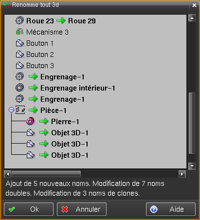 Voir la fonction Création matière . Supprime limit (957) La fonction Supprime limitation traite plus de cas et la sélection est simplifiée. Renomme tout 3d (2389) Cette fonction agit sur les entités objets, maillages 3d, pièces 3d, animations et montages en ajoutant un nom aux entités sans noms et modifie les noms identiques sauf pour les vues liées de composant ou les entités clonées.