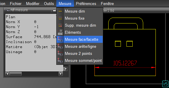 Voir Habillage des détails de zone vue . Menu « Mesure » Le nouveau menu « Mesure mise en plan » propose une sélection de fonctions s'appliquant au 2D de la mise en plan (cartouche et autres), à l'habillage 2D des zones vue , ainsi qu'aux entités 3D visibles dans les zones vue ou dans les éventuelles fenêtres 3D hors mise en plan. Les liens avec le 3D (points d'accrochage) sont affichés lors de la mesure. La fonction (Mesure) éléments de ce menu permet d'afficher des informations sur les objets volumiques et sur les zones vue .