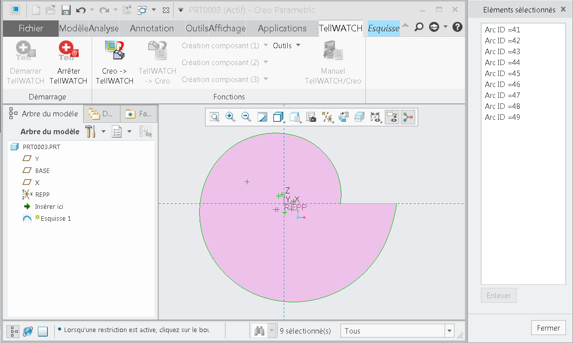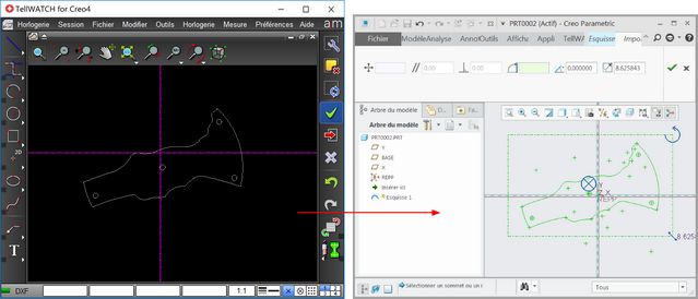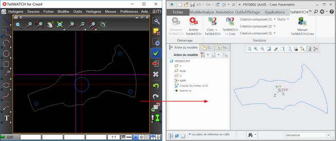 CONVERSION Creo3, Creo4 Import d'un contour dans une esquisse Cette fonction permet d'importer des entités 2D de Tell dans une esquisse via un fichier DXF.