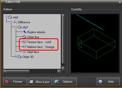 HOB Ergonomie et optimisation des fonctions matière et texture Les noms des matières et textures sont affichés dans l'éditeur de l'historique de construction en regard des noms des fonctions Matière objet , Matière objet+face , Matière face et Texture face .