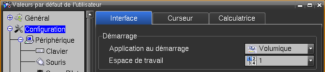 Voir les options d'affichage du curseur . Application au départ de Tell Il est possible de sélectionner, depuis les options de l'utilisateur sous configuration de l'interface ou depuis les options de démarrage, l'application et l'espace de travail au départ de Tell.