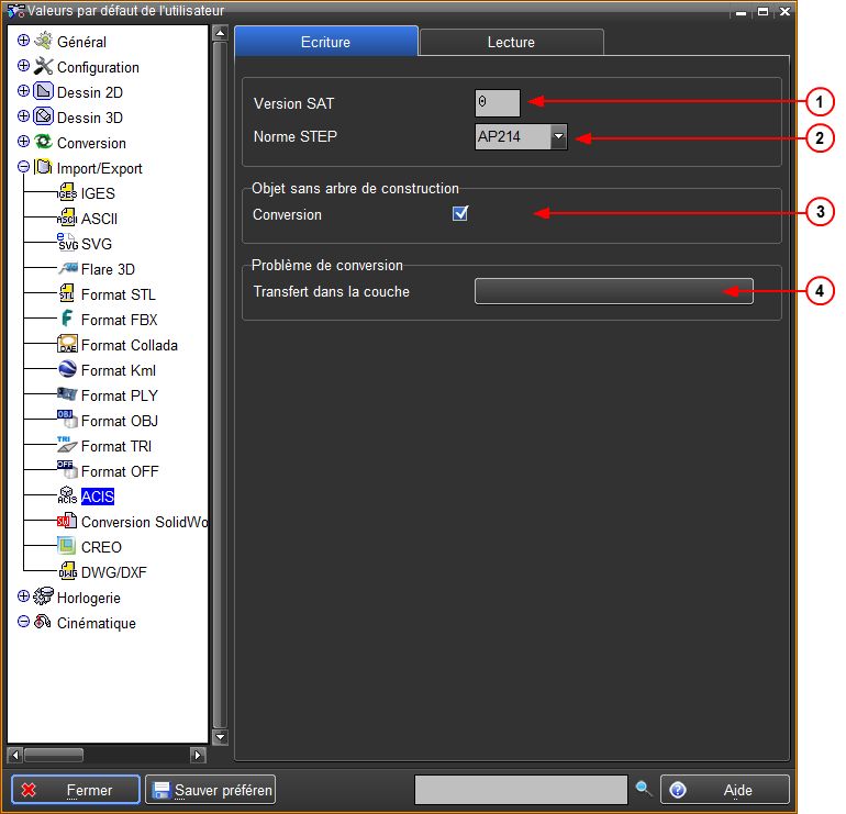 Les options de conversion STEP/SAT sont accessibles depuis Préférences->Graphique