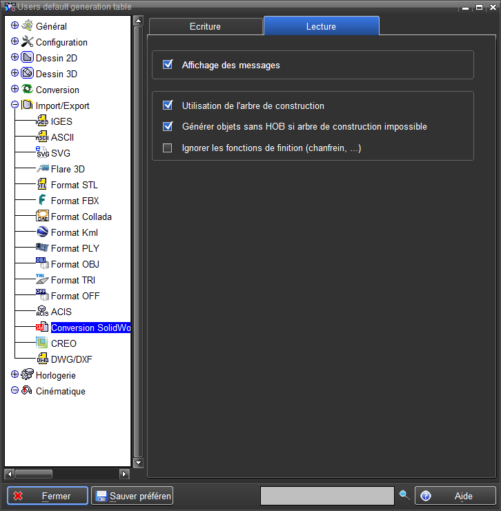 Les options SolidWorks sont accessibles depuis Préférences->Graphique->Options.