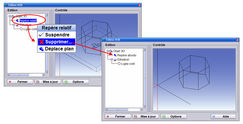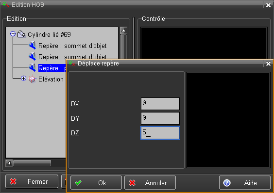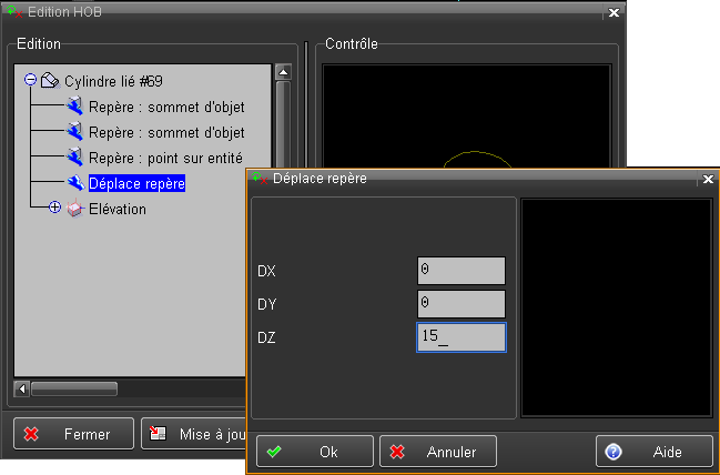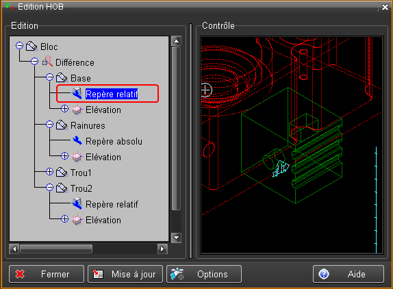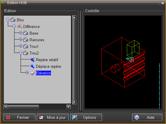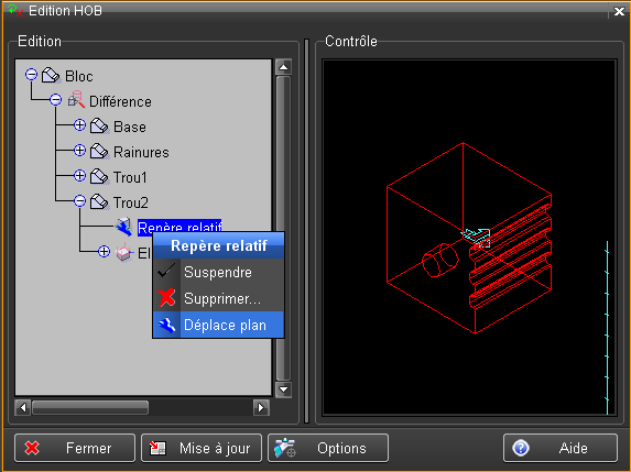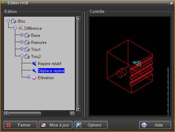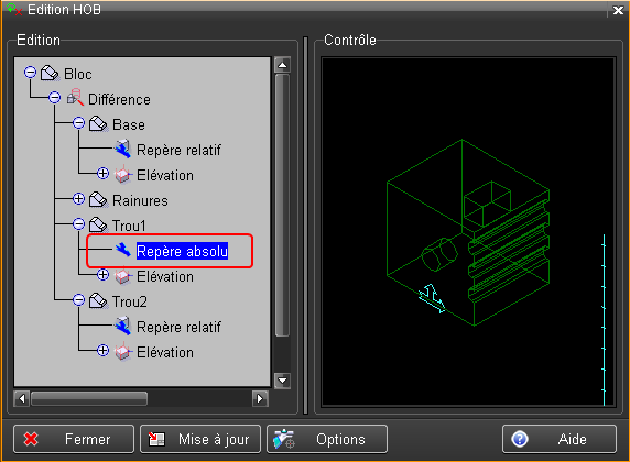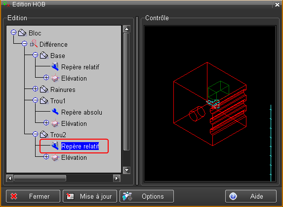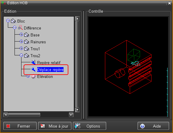 L'objet "Trou2" du HOB, est maintenant déplacé, il a suivi le déplacement de son repère relatif introduit ci-dessus.