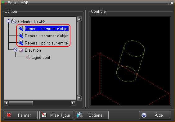 Autre exemple : repère lié créé sur trois points ou sommets 3D. Dans ce cas particulier, trois lignes d'attributs sont affichés dans le HOB.