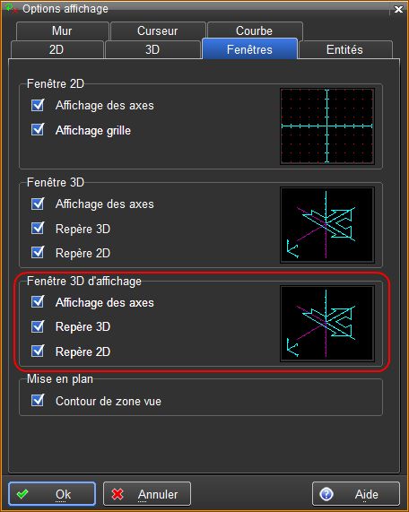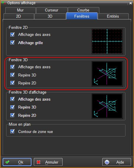 Choix de l'affichage des axes XYZ, des repère 2D et repère 3D. Utiliser de préférence la fonction Options d'affichage (fonction 588 - raccourci : MODIF sur la fonction Point auto On/Off au bas de la fenêtre Tell), onglet "Fenêtres".