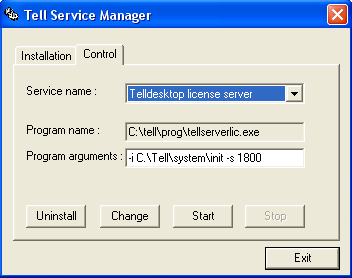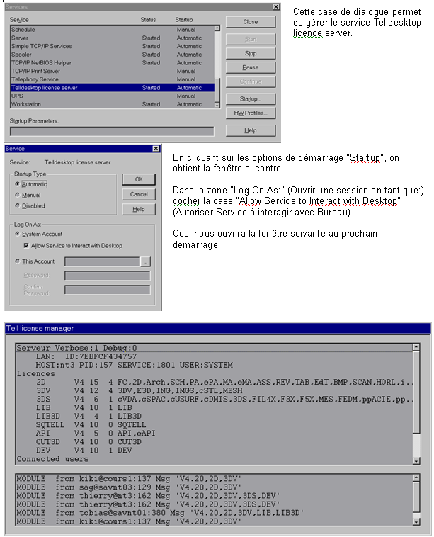 Gestion du service Telldesktop licence server Nous pouvons gérer ce service avec le programme ..\tell\prog\licence\service manager.exe vu précédemment, ou directement par le gestionnaire de services de Windows NT.