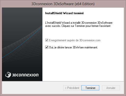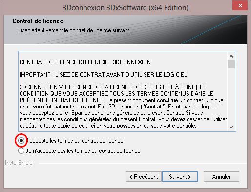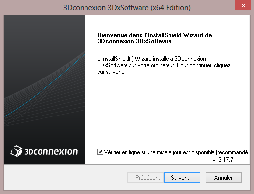 Les drivers pour Windows XP, Windows Vista, Windows 7 et Windows 8 pour 32 et 64 bits sont disponibles dans le répertoire tools\3dconnexion du CD d'installation ou sur le site de la société 3dconnexion http://www.3dconnexion.fr .