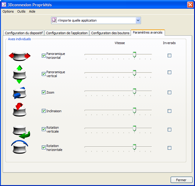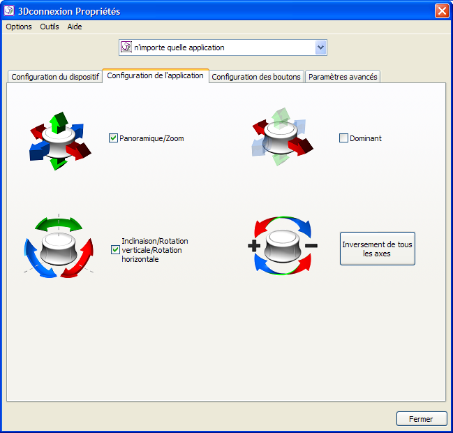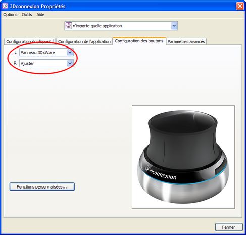 Le bouton de gauche doit être configuré avec 'Panneau 3DxWare' qui affiche ce menu de configuration.