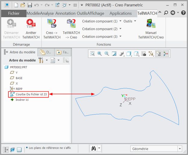3. Courbe crée dans Creo. Cette courbe sera placée dans le plan XY du repère nommé "REPP" s'il existe. Si ce repère n'existe pas, le repère absolu est créé et cette courbe sera placée dans ce repère.
