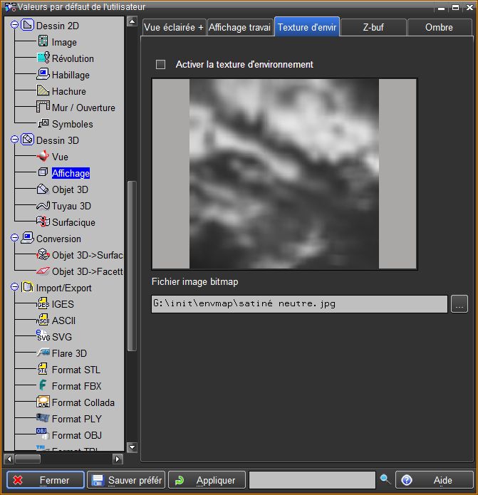 Il est possible dans les paramètres de l'utilisateur d'initialiser ou de modifier la texture d'environnement appliquée sur les objets 3d lors d'un affichage en vue éclairée. Si la fonction Enreg. param 3d avec dessin est activée la texture d'environnement est enregistrée avec le dessin.